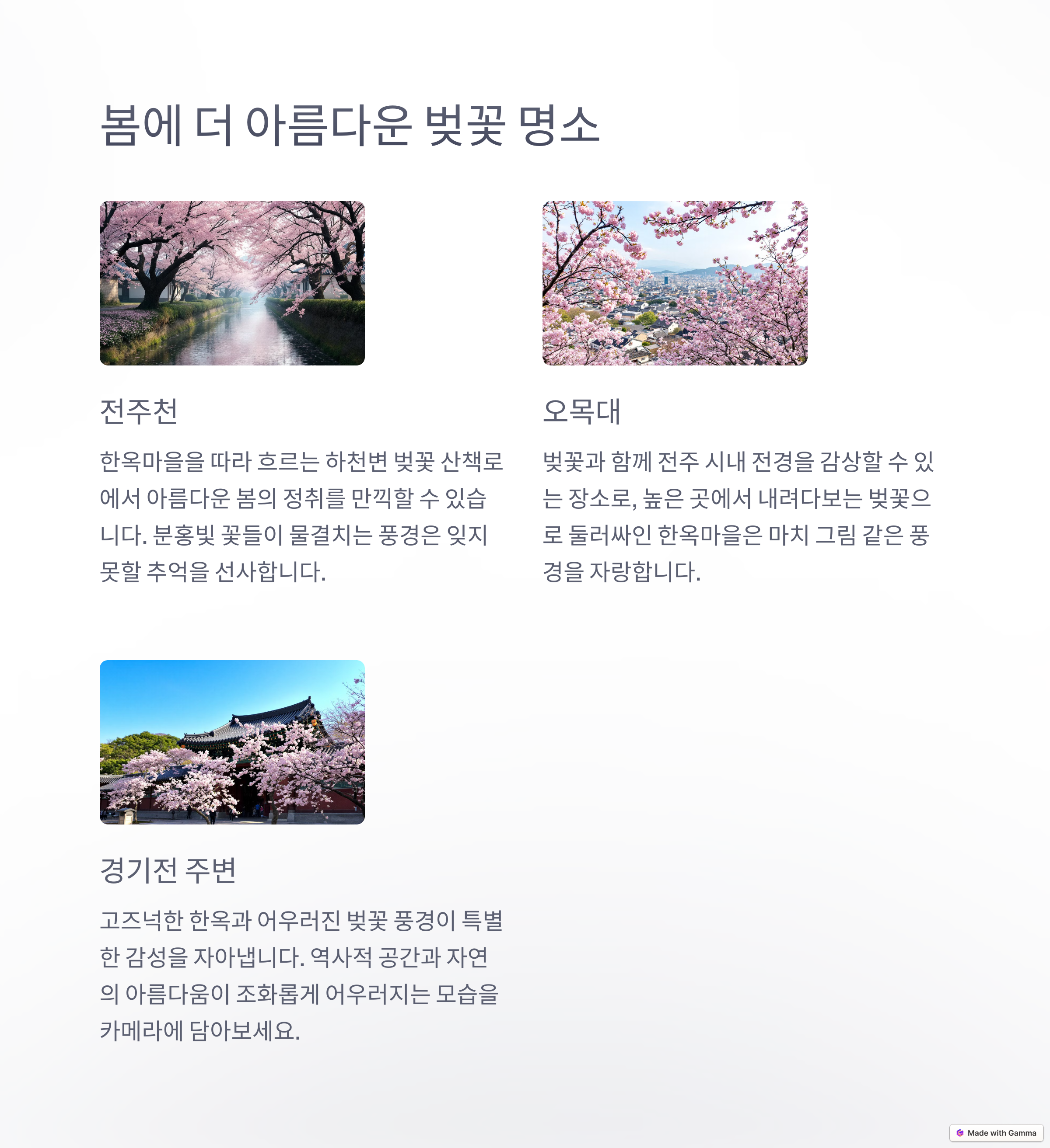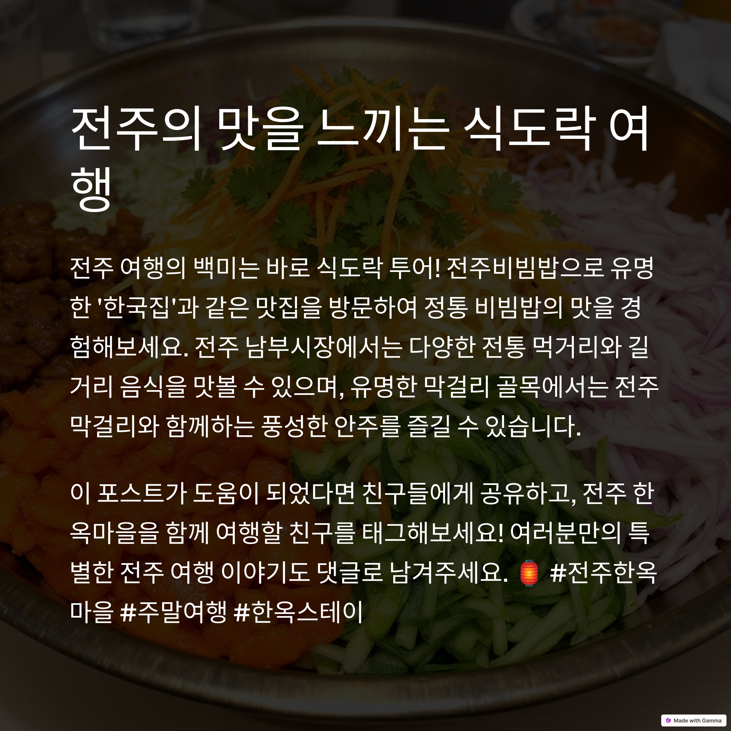 전주 한옥마을은 전통과 현대가 공존하는 특별한 공간입니다. 특히 봄철에는 벚꽃과 어우러진 한옥 풍경으로 수많은 여행객들의 사랑을 받고 있습니다. 이번 여행에서는 전통 체험과 인생샷 명소를 함께 즐기며 감성적인 숙소에서 편안한 시간을 보내보세요. 전통의 숨결을 느끼고, 소중한 사람과 특별한 추억을 만들기에 최적의 장소가 될 것입니다.