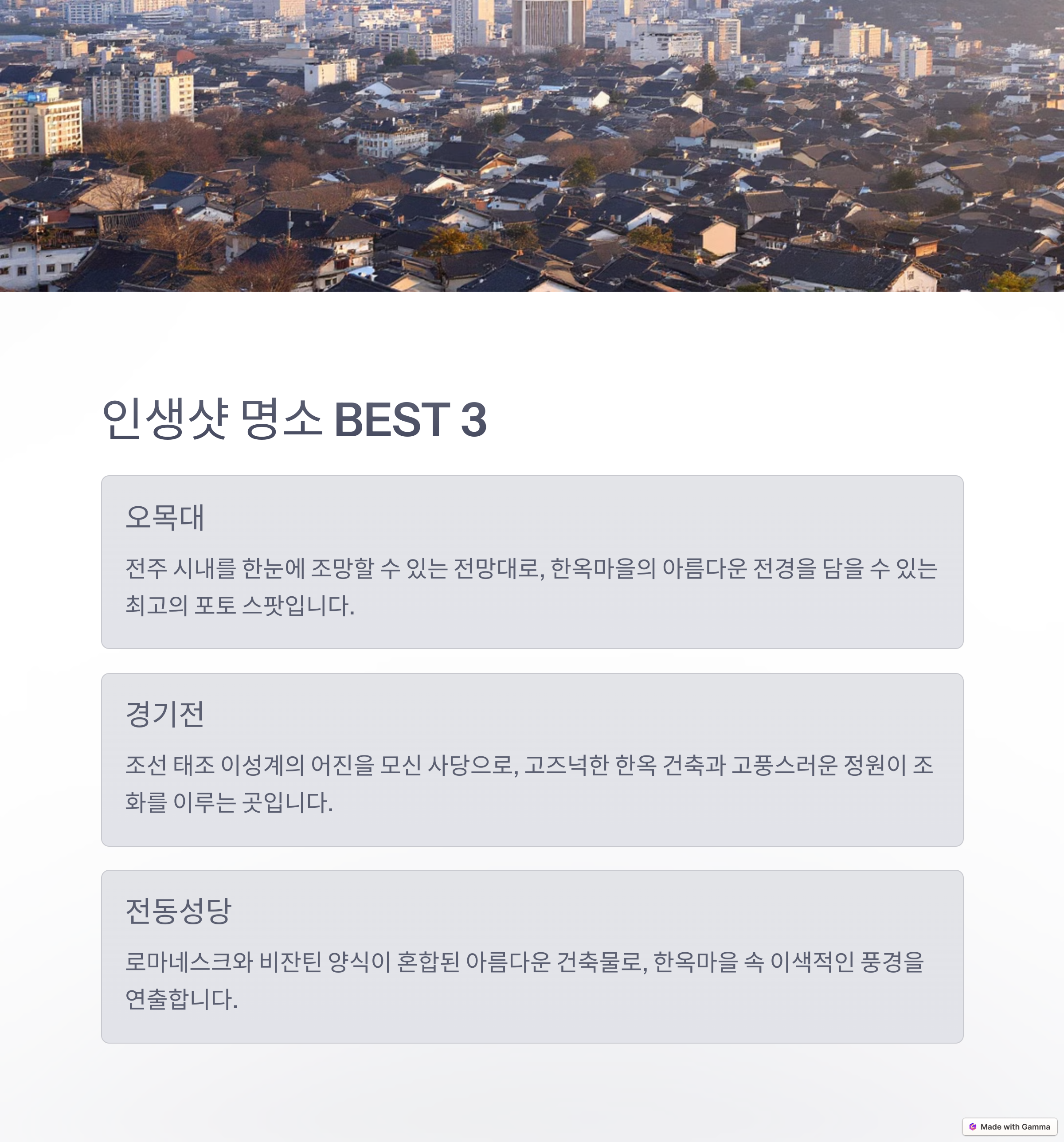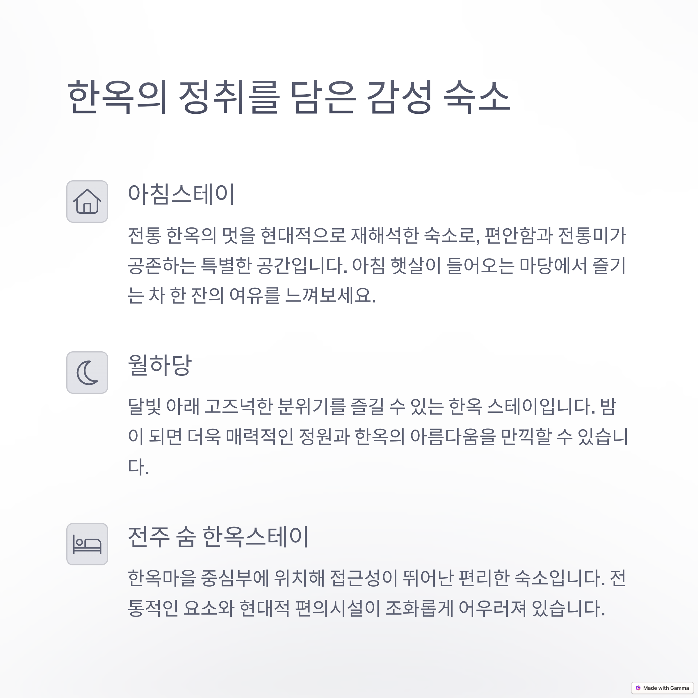 | 오목대, 경기전, 전동성당 | 아침스테이, 월하당, 한지꿀잠 | 도보 이동 추천, 주차 확인 필수 |
